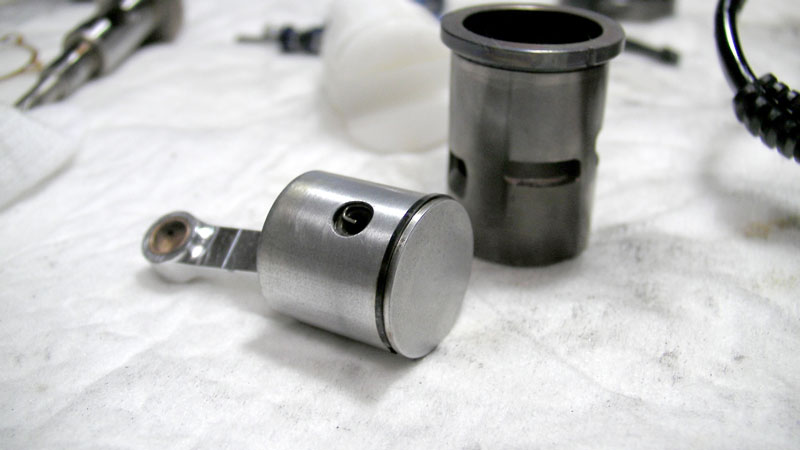 シリンダライナーも傷などなく、ピストンも問題なさそうです。ピストンは頂部と側面を軽くサンディングしてきれいにしておきました。シリンダライナーの排気ポートはスラッジが結構たまっていたのでこれもワイヤブラシで落としておきました。