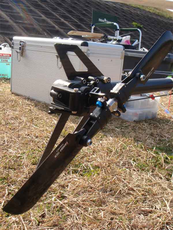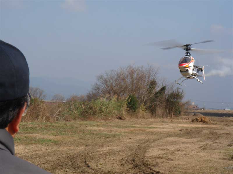年末の破損以来、細々と修理を重ねてきたOSスカディーですが、やっと組み上げが完成したので調整がてら飛行場へ赴きました。天候は晴れ。しかし強い低気圧の影響で日曜日ほどではないにしてもかなりの強風が吹いています。風速計で測ると平均して6~7m/sec、瞬間では10m/sec以上の風が吹いています。地上付近でこの値ですので、上空ではさらに強い風が吹いていることが予想されます。外乱で落としてしまうのがかなり怖いので、とりあえずホバリングを中心にテールを調整していきます。