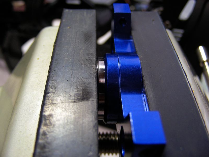 続いて、メインマスト受け用のベアリングホルダー修理です。10φx19φのベアリングが圧入されているので叩き出します。交換用のベアリングにオイルを塗りバイスで再び圧入します。ここで気づいたのですが、ベアリングの厚みが2mmほど違います。HIROBO純正は厚み5mmですが、クイックの部品は7mm程度あります。まぁ、しっかり圧入・固定できているのでとりあえずこのまま進めます(笑)