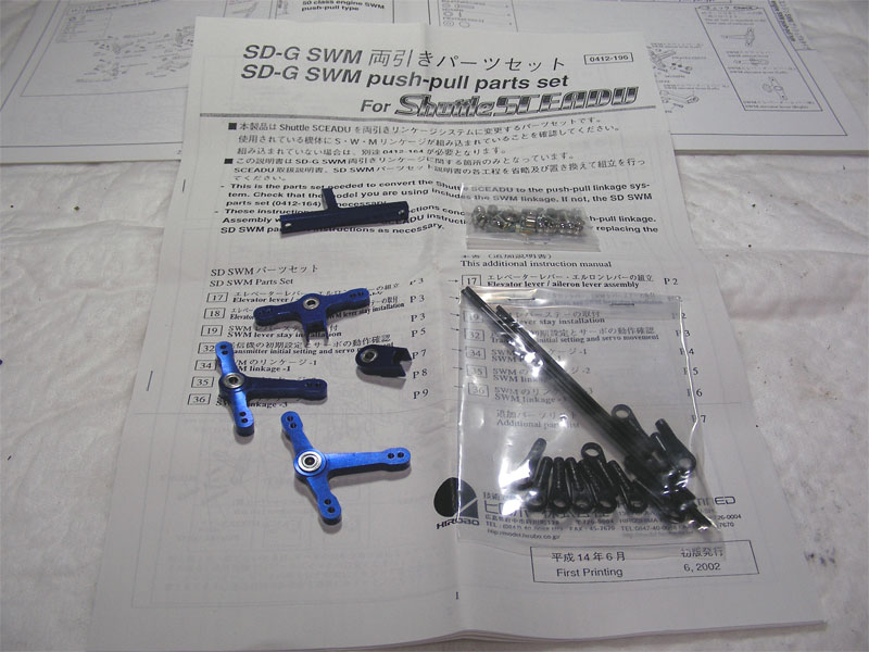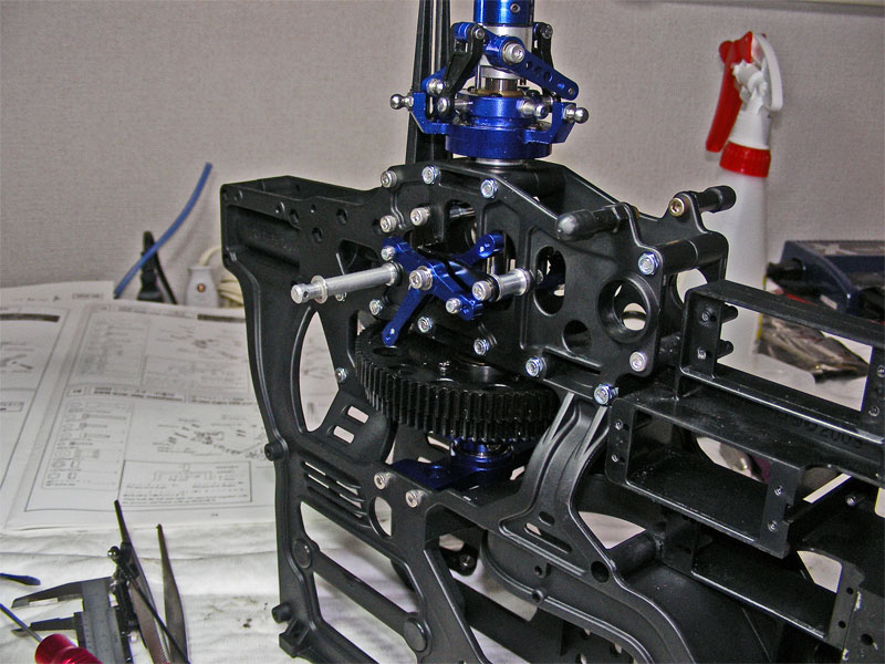 ヒラーコントロール部のリンケージロッドはいくつか変形していたので、新品に交換します。新品のリンクエンドを見て気づいたのですが、なんとリンクエンドにもサーボホーンと同様にいくつかの番号が振ってあります。おそらくネジ切りの回転角が微妙に違うのでしょうが、そこまで凝るほどではないので適当にリンケージを組み立てます。で、ヘッドまで組み上げたのがこちら。これからエルロンやラダーなどのリンケージを組み上げていきます