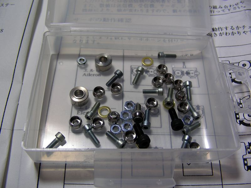 リンケージは今まで片引きでしたが、これを機会に両引きに変更します。プラ製のPPパーツでもいいのですが、せっかくですのでヒロボーブルーのSD-Gパーツに。 ベアリングなどはすでに圧入済みですが、ボールリンクなどは何も取り付けられていない状況ですのでまずはこれらを取り付けます。部品点数は少なめですが、 細かなパーツが多いので別容器に移しておきます。