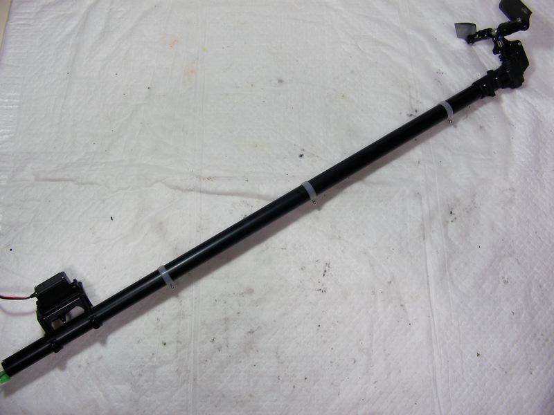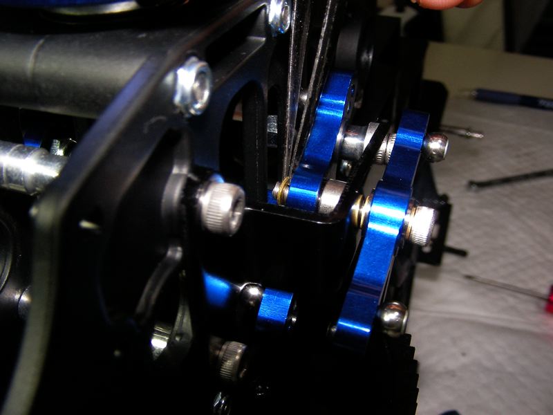 1時間少々かけてやっと完成したエルロン・エレベーターレバーの取り付け後がこちら。青いパーツが映えます。そして次はテール部分の取り付けです。テールケース近辺は大きな損傷もなく、そのまま使用できそうな感じだったのですが念のためテールシャフトのみ交換し ました。スカディーのテールはベルト駆動式なのでタイミングベルトをテールパイプに通しますが、その際先端部をテープなどで借り止めしておくと変にねじれ たりする可能性が少なくなります。で、テール部も完成。すでにラダーサーボが付いていますが、分解時のまま取り付けているからです。