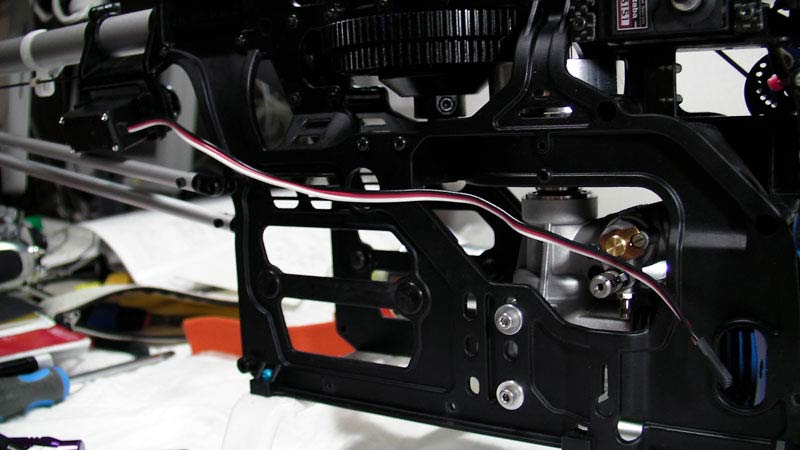 S9254サーボも取説通り取り付けましたが、ここで問題が発生。どう見てもサーボからアンプまでケーブルの長さが足りません。GY401の時はジャイロ本体から出ているコネクタに 差し込めば良かったので長さ的には特に問題なかったのですが、アンプが機体前方にあるため届かないのです。ジャイロ本体のケーブルは余裕を持って取り回しが効く長さになっているのですが・・・。ケーブルの長さが足りません・・・