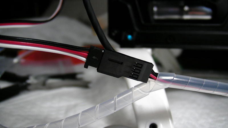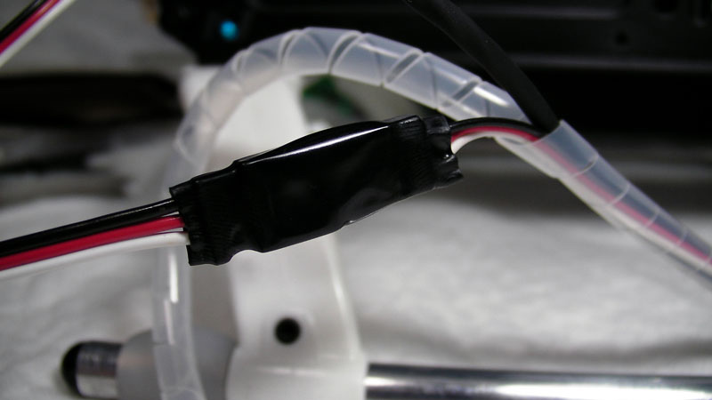 仕方ないので延長ケーブルに登場願います。部品箱に入っていた延長ケーブルがついに日の目を見ました(笑) たかだか20cmのケーブルですが、これだけでかなりの余裕が。接合部は外れるとまずいのでヒートシュリンクしておきました。脱落防止コネクタの使用も考えましたが、ごつくなるので今回はこれで様子を見ること にします。左:シュリンク前 右:シュリンク後