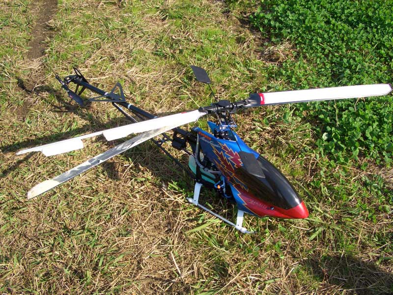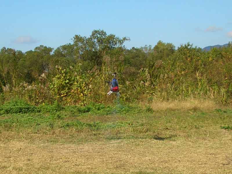 なんと上空15m位でエンストです。甲高いエンジン音は無声と化し、ローターの風切り音だけが聞こえてきます。冷静必死に手前へ移動させ最後に大きなフレアを 掛けましたが・・・ほぼ水平に着地したのでローターなどの損害はなかったもののローハイトスキッドフットが一部折れてしまいました。損害は軽微でした。 1400円くらいでしょうか(笑)