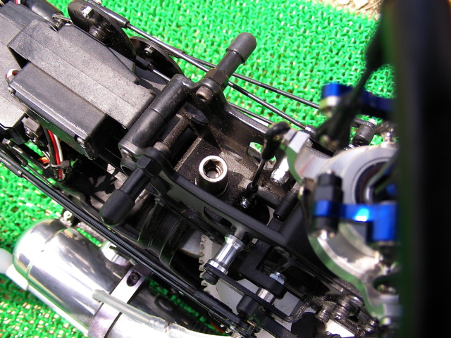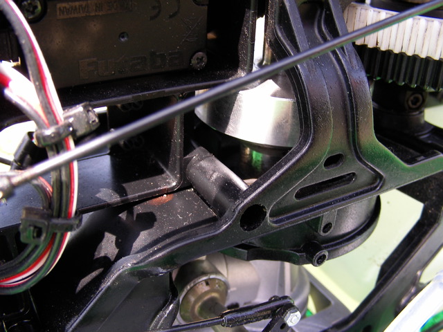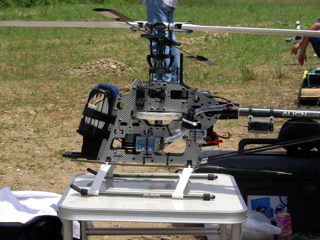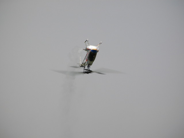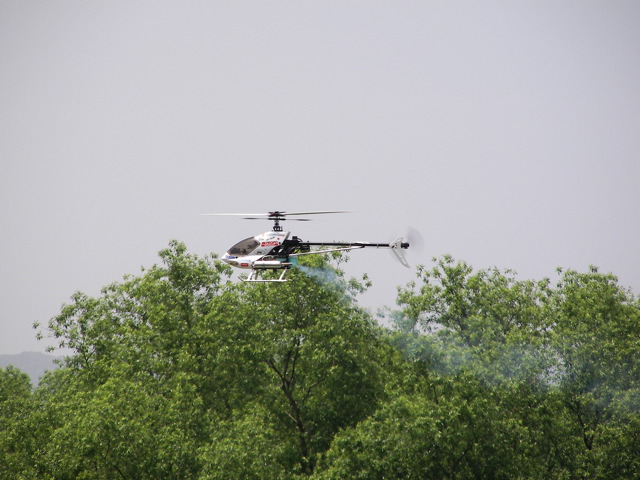 僕の方はといえば、HOLDまで設定済みのYSスカディーをまずフライト。NORM・IDL1・IDL2いずれもなかなかの設定です。ホバリング域の 50%付近がやや過回転気味のようですのでホバリングスロットルで少し抑えめにしておきました。いずれスロットルカーブを変更する予定です。IDL1は OSスカディーでも設定しているので何となくフライトできるのですが、IDL2がかなり怖いです。マイナスピッチを-10°程度に設定してありますので、 スロットルを下げればそのまま地面に激突しそうな勢いで降下してきます。さすがにHOLDは試せませんでしたが、ピッチに関しては特に問題なく設定できて いるようです。後は好みで微調整、といったところでしょうか。OSスカディーは新キャビンで飛ばしてみます。もう少し明度の高い赤にした方が良かったのかもしれませんが、赤白ツートンの視認性はそれほど悪くないで す。こちらはIDL1までの設定ですのでとりあえず上空飛行、ループなどを。まだ目の前の水平飛行の感覚がつかめず、どうしても自分の方向へよってきま す。特にループ抜けの後などはかなり怖いです。もっと遠くへ機体をやれるように練習しないといけませんねぇ。最後に機体を降ろしつつホバリングするのです が、どうも動きがカクカクしてます。何かに引っかかっているような感じです。最初キャビンにリンケージが引っかかっているのかと思いましたが、よくよく調 査するとスワッシュプレートの引っかかりのようです。スワッシュプレート内のマストを通しているボールと周囲のベアリングで少し動きにガタが出ているよう です。注油したところほぼ元通りになりました。