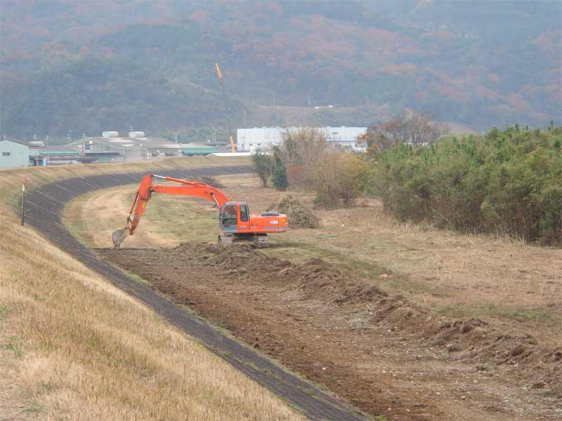 さて、以前から気になっていた飛行場ですが上流ではすでに工事が始まっていました。工事期間の看板をみたところ12月から3月10日まで堤防の護岸工事を 行うようです。ショベルカーとブルドーザーなどがすでに配備されていて、あとは一気に工事を始めるようです。山を崩すような大がかりな工事ではなく、平ら な河川敷の整備ですから比較的早期に終わるような気もしますが、お役所仕事はわかりません。どうなることやら・・・。とりあえず飛ばせそうな期間は飛ばし に行こうと思っています。そうはいってもこの土日、仕事で全く動けません(泣)