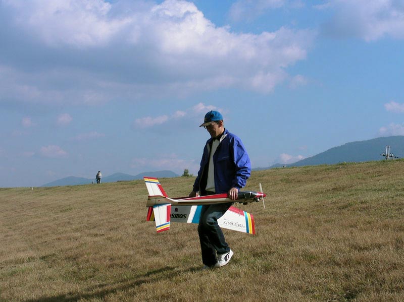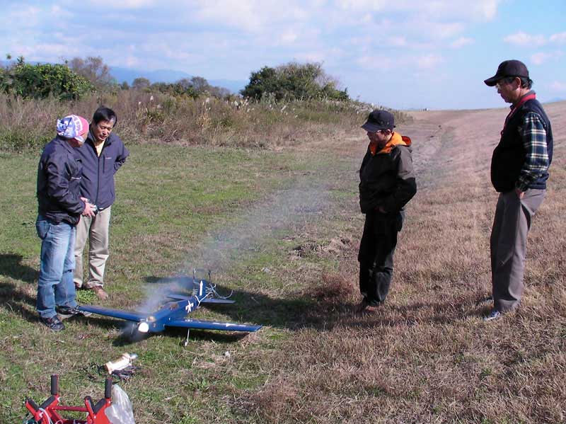 飛行場は天気が良かったのでずいぶんたくさんの人出が。最終的には9人が出動するという賑わいになりました。I戸さんの3Dも青空に映えます。K2さんや Kさんもブンブン飛ばしていますし、K2さんは電動飛行機も飛ばしています。Tさんはいつものように大型電動機を軽快に飛ばされ、飛行機のY2さんは O/Hしたてのエンジンを積んだ飛行機を慣らしもかねて飛ばされていました。いつもはヘリのUさんも今日はI店主から飲み代の代わりに引き取ったという(笑)飛行機を持参。エレベーターアップでスナップロールがかかるという怪しげな飛行機です
