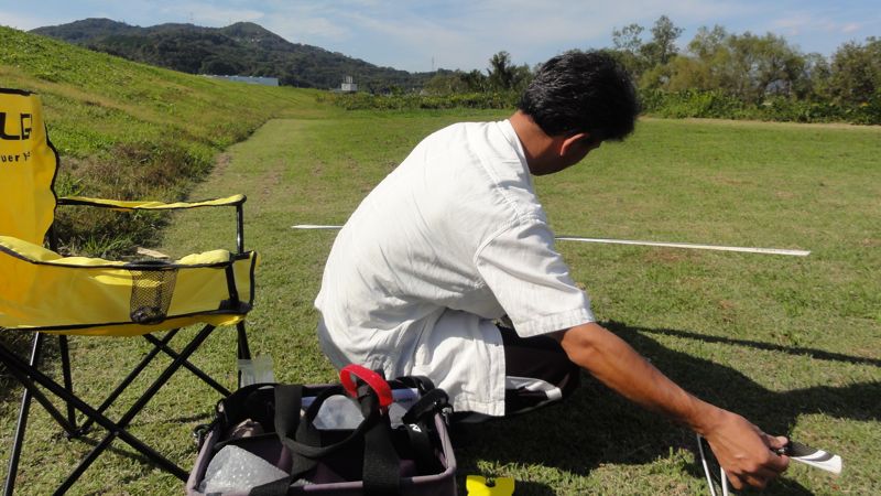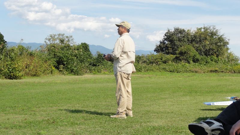 飛行場はとっても良いお天気で、飛行機やヘリも飛んでいましたが、変わり種も登場。以前、この飛行場でよく飛ばされていたM先生です。T大学で教鞭をとっておられますが、研究室で作られたダクテッドファンを2台積んだ謎のロケットっぽい飛行物体を飛ばされました。推力偏向方式で、ファンはそれぞれ2つのサーボでXY軸を制御されています。近未来的でよくわかりませんが、すごそうです(笑)