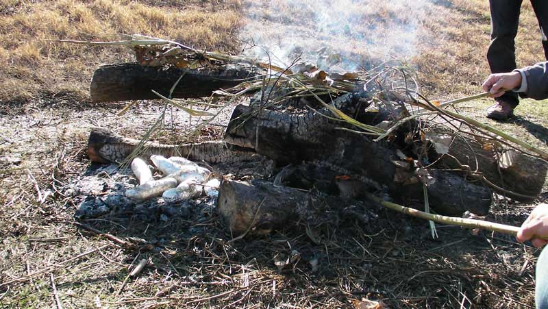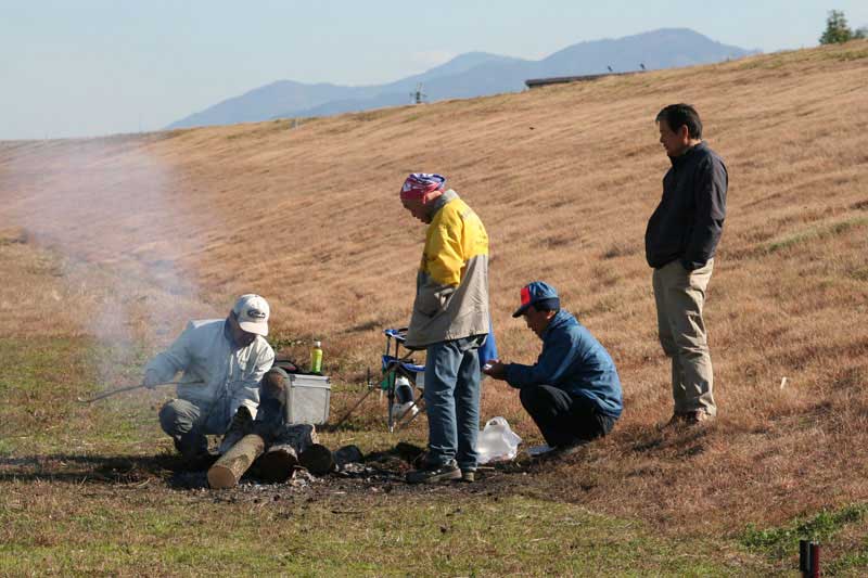 同じく飛行機組のYさん。こちらはいつもの電動機以外にT-REX450を持参されていました。以前にも見かけたことがあったのですが、飛ばしているのを見たのは初めてです。【飛行機と違ってとりあえず浮かすだけしかできへんけどなぁ】 といわれていましたが、なかなかどうして安定したホバリングをされていました。600クラスと違い、かなり静かな感じです。また、SRBなどの固定ピッチ のヘリでもないので機動性も俊敏で面白そう。SRB売り飛ばして可変ピッチ買いますか(笑) なお、今日は焚き火をして焼き芋を作りましたが、準備してい ただいたのはYさんでした。どうもごちそうさまでしたm(__)m