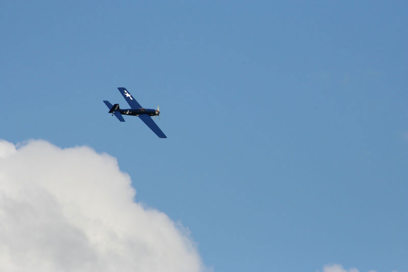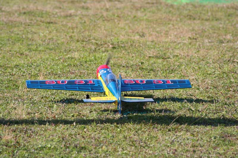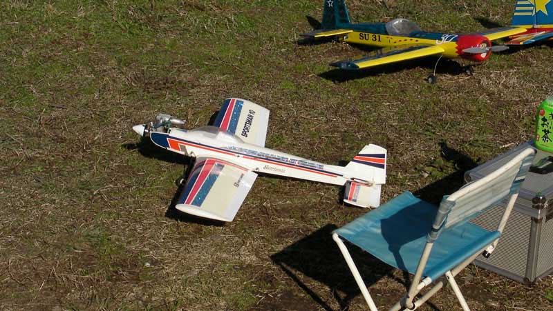 さらに飛行機組のY2さんは4ストGP機を。アメリカ軍のF6Fを思わせるカラーリングです。ローパスで目の前を通過すると機銃掃射でもされるんじゃなかろうかと思わせます(笑) 対空砲火を準備しておかないと(^^;;