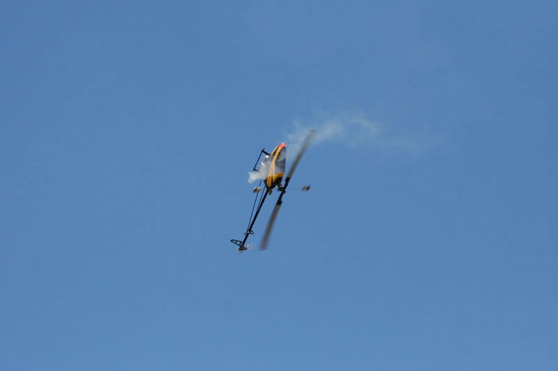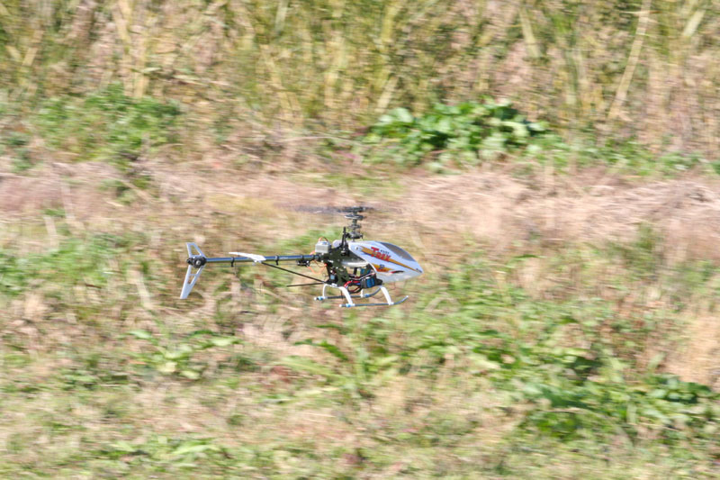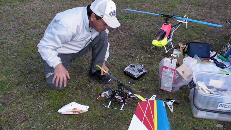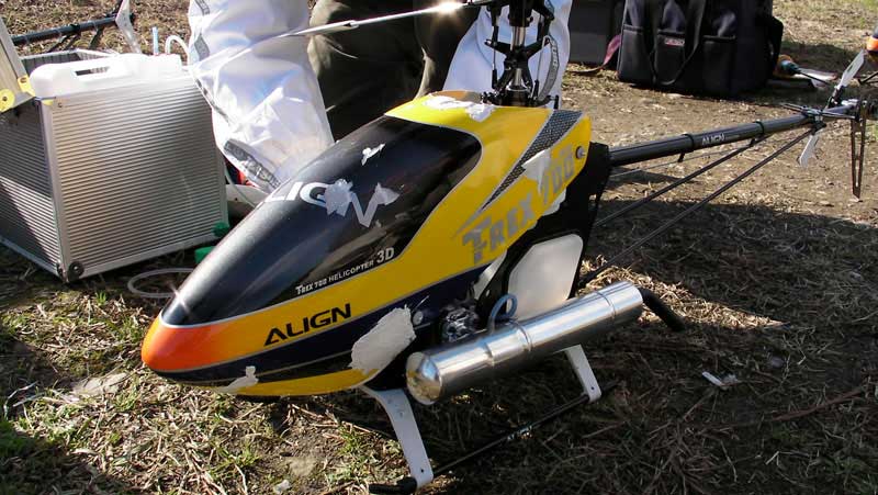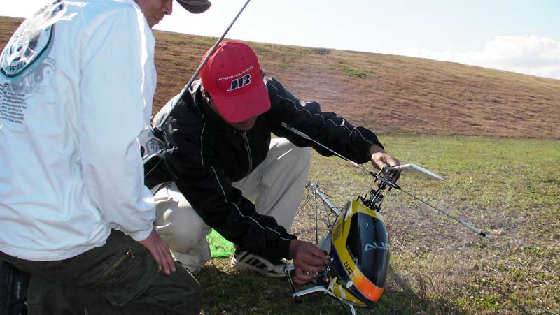 ヘリのYさんは先日墜落したT-REX700Nをひっさげて登場。ズタボロになったキャビンはFRP補修キットでとりあえず補強されていました。FRPの高級キャビンですが補修が面倒らしく(笑)、I戸さんからはカッティングシートで補修してみたら?とアドバイス。買えば¥10K位するそうなので、当分はこのままかPPキャビンも考えているそう。Yさんが飛ばすT-REX700Nは初めて見たのですが、今日は主に調整飛行のみ。チクタクでやや回転落ちするのはガバナーの設定では?ということで、ここもI戸さんのアドバイスが入りました。時間の関係で調整後のフラ イトはできませんでしたが、まだまだブン回せそうな感じでした。