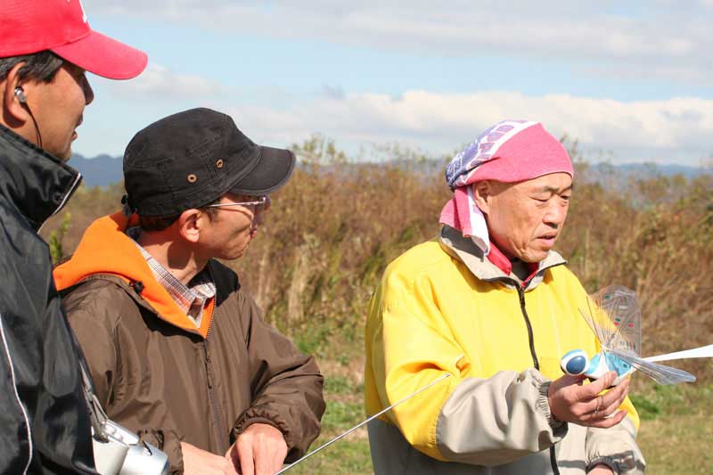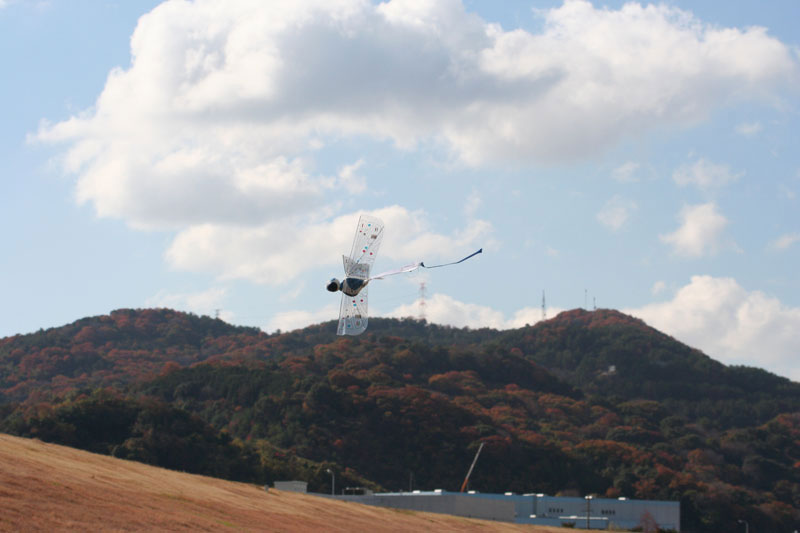 ほかにもいろいろ飛ばしていただきましたが、特に目を引いたのがK2さんのメカトンボ。 バタバタと羽ばたくインドアフライトのラジコンですが、風もあまりない時間帯に飛ばしていただきました。今日が処女飛行とのことでしたが、気候条件や羽ば たく強さを変えることで結構面白い飛びをしそうです。羽自体に滑空する効果があまりなさそうなので、羽ばたかせてナンボといった感じでしょうか。体育館な どで飛ばせばかなり面白いかも知れません。