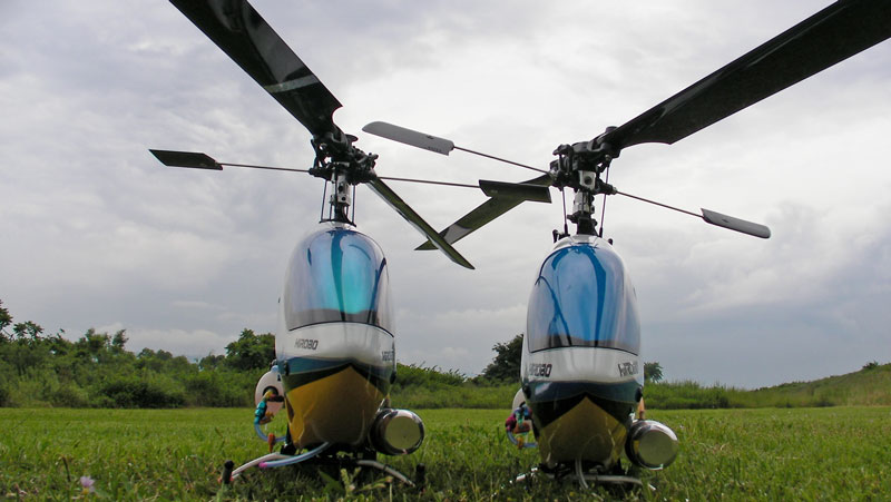 初号機はガバナーの調子とヘッド温度を確認しつつ4タンク。最初2タンクは上空フライト系をやってみましたが、機体が見にくいので残りは基礎練に変更。ちなみに最高ヘッド温度は127℃でした。基礎練は定レートピルエット・背面ホバリングを中心に飛ばしました。背面ホバリングはガバナーの影響もあり比較的イージーなのですが、急いで上昇させたいときなどは一瞬スロットルが遅れる感じです。それほど気にはならないのですが、危なっかしいフライトばかりしている僕にとっては、やはり少し気になるかも…