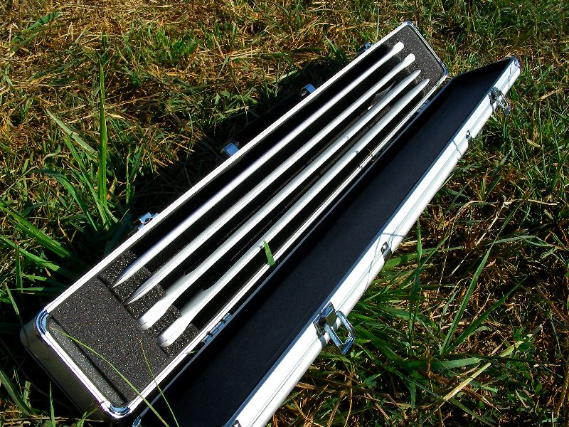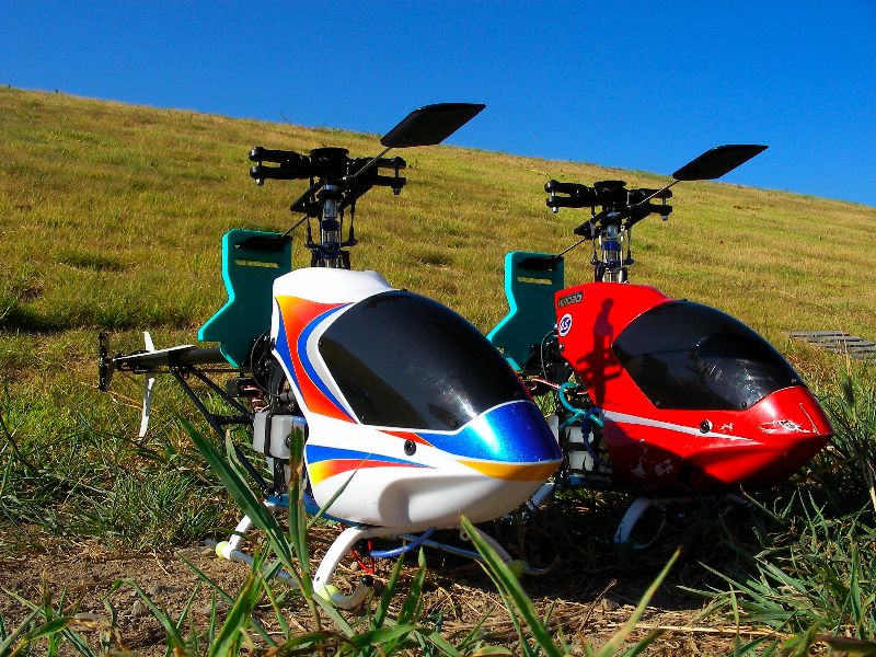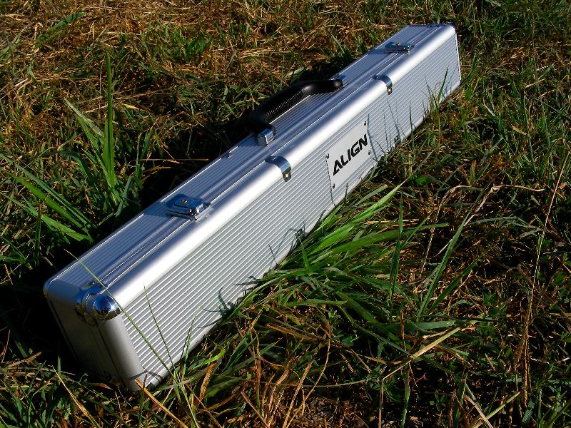 降ろしてみると自作ターミナルプレートにクラックが入り折れていました(泣) 今までは1mm厚のアルミプレートだったのですが、2mm 厚のプレートに変更しないといけないようですねぇ・・・。さて、しばらくするといつものお仲間Yさんが登場。YS/OSの2機のスカディーをひっさげての登場です。見慣れないアルミケースはALIGN製のブレードケース。90クラスまでの2組が入るようです。かっこよさげなので思わず欲しくなってしまいました(^^;;