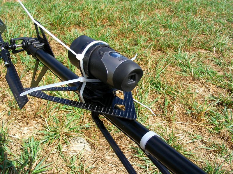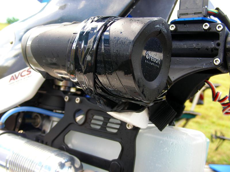 まずI戸さんのアイデアで、テールパイプ状への設置を試みました。スワッシュプレートが映り込む位置なのでなかなか面白そうです。しかし実際に飛ばしてみ たところ、テールヘビーの傾向が強くまともに飛ばすことが難しい感じになってしまいました。常にエレベーターアップを引いている感じです。トリムでの調整 も考えましたが、もう少し無難な場所への設置を模索することに。
