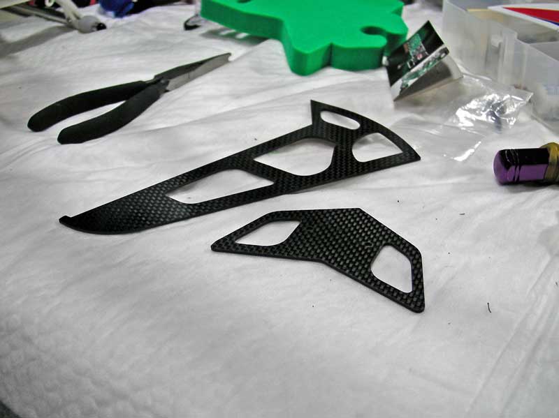 その後I店主の元へパーツ調達。ジャイロ感度を上げるためにサーボホーンの穴位置を変えてみてはと のアドバイスを受け、今までの軸中心より19mmの位置から13.5mmに変更し穴開け。サーボ位置も一段高く固定しロッドを水平に保つようにしておきま した。なぜか前オーナーの手によってコントロールロッドガイドが4つに増えていたので、説明書通りに間隔をそろえ、3つに変更。ついでに水平垂直尾翼をス トックしていたT-REX600用のカーボンパーツに変更。水平尾翼はかなり小さく、あまり意味をなさないような感じです。3D用という感じでしょうか。安いのですが、K&S製のものに比べるとカーボン板の厚さが薄いです(笑) T-REX700用のものだともう少し厚いのでしょうか?