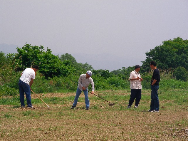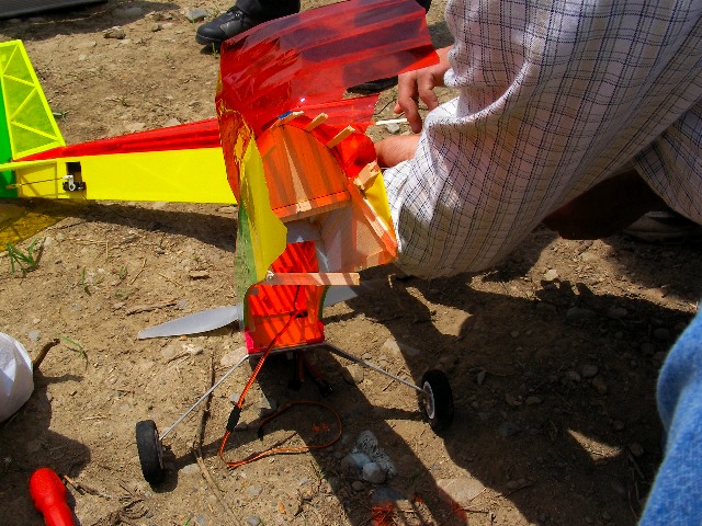 飛行機組にとっては飛行場の整備が欠かせません。しかし、まだまだ地面は荒くかなりの大きさの石がごろごろしています。地道に手作業でならしたりしていま すがまだまだ不十分です。荒芝でも生えてくるとマシなんでしょうが、今はホコリと岩石に手こずっています。飛行機組のもうひとり、Tさんは堤防上の舗装道 路を滑走路として使おうかと思っているようです。確かに立派な舗装路なので飛行機の離発着は随分楽そうです。幅が4mほどしかないので着陸にはそれなりの スキルが必要ですが、KMA中級部での優勝経験があるほどの腕前だと大丈夫でしょう(笑)