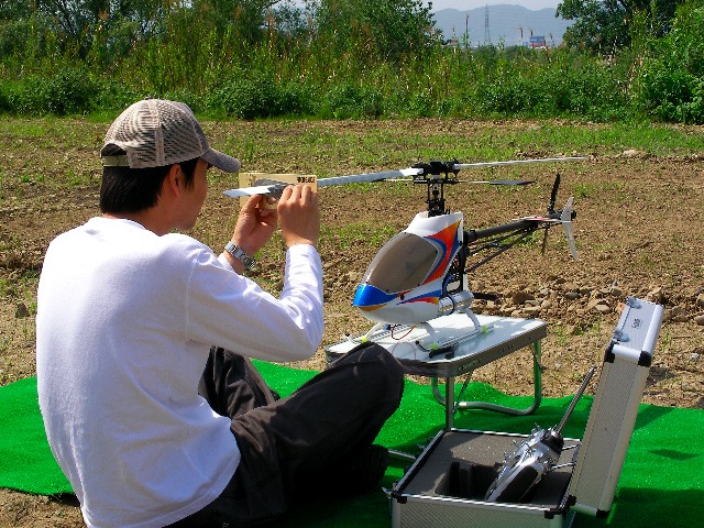 いつもの中津村・田辺組もフライト。中津村の方はついにループを完成させました。しかも最後はさて、最近スカディに多いトラブルがシーソーをセンターハブに固定するナットのゆるみです。大抵がベアリングごとはずれてしまうようです。外れたからと いって即ノーコン→墜落とはなりませんが、舵の効きが鈍ったりして操縦しにくくなるようです。幸い、僕の機体ではそんなことはないのですがスカディを飛ば されている方は少し注意が必要かもしれません。