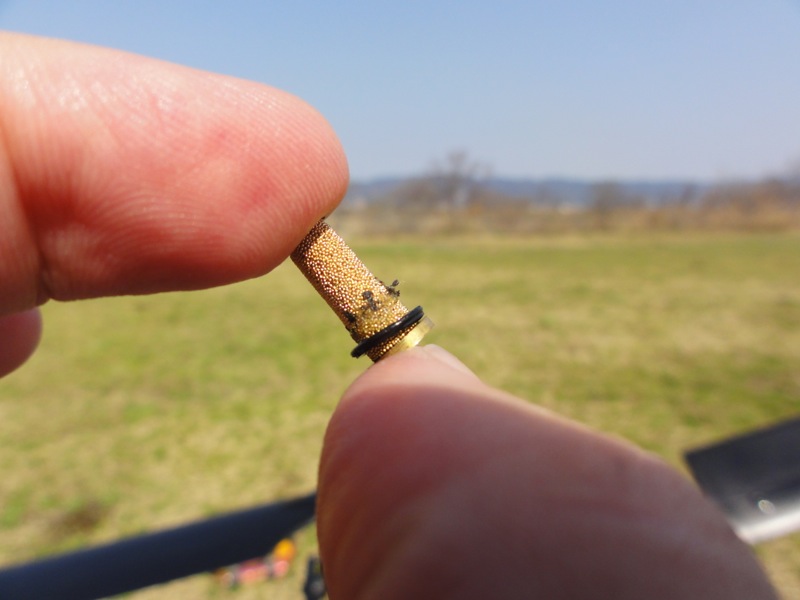 さてさて、今日は弐号機を3F。1F目はラダーのニュートラル出しフライト。若干右にずれていたので直しました…が、妙にエンジンが元気。ニードルはかなり甘めなのですがギラギラしてます。おかしいと思ったトドメはアイドルアップ解除の時。ノーマルなのにエンジン回転がなかなか下がらないので早速点検。キャブを外し分解清掃の上、配管を見なおしたところ燃料フィルターが詰まりかけていました(^^;;