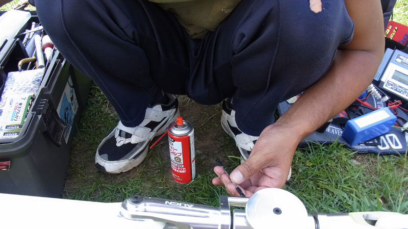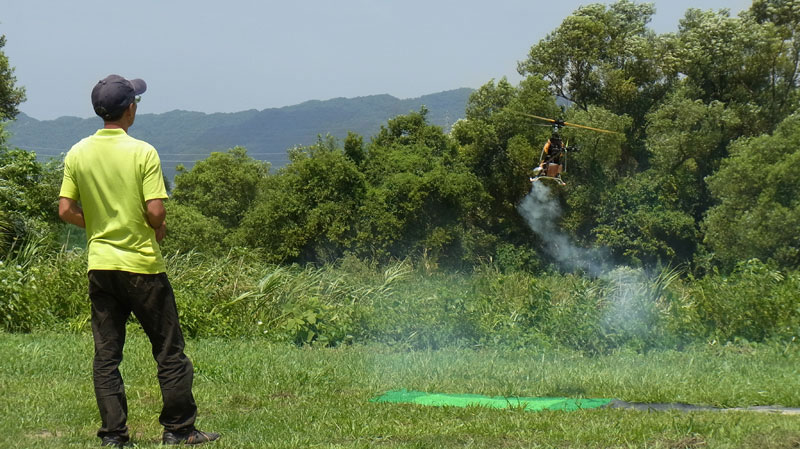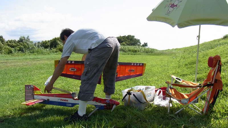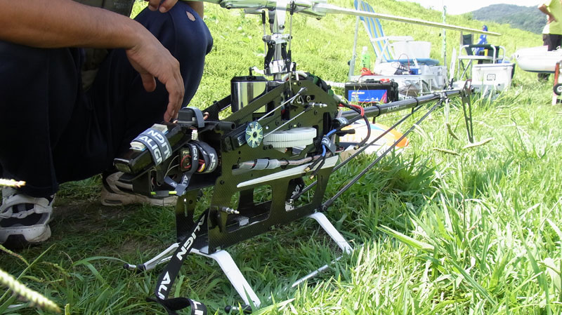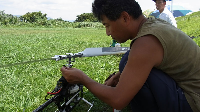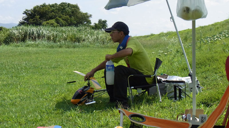 。残暑厳しいため早めにでかけました。飛行場には7時30分すぎに到着したのですが、すでに誰かがヘリをブン回しています。どうやらUさんのよう。僕は2番のりでした