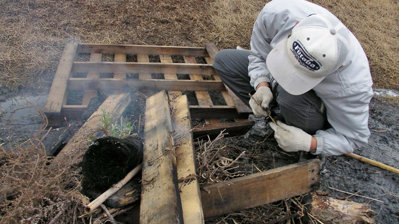 左:なかなか火が付かず苦戦するYさん 右:必殺【I戸送風機】