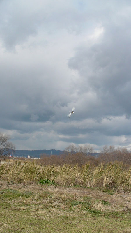 気を取り直し、壱号機をフライト。I戸さんから【簡易プロポカバー】を拝借しフライトさせます。2.4GHzじゃないのでアンテナの長さが少々辟易しますが、少なくともプロポ横から当たる寒風の軽減は相当なもの。こりゃスーパーのビニール袋でも十分かも。見た目は悪いですが・・・(笑)