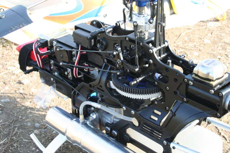 送受信機はすでに2.4GHz仕様、FF10Hです。マフラーはハットリの3D用、ヘッド回りはSD-Gパーツ群です。スワッシュはすでにタービュランスのものが取り付けられています。また、スキッドは噂のVJPスキッド。かなり低くなっていてスキッドパイプ自体も細くなっています。オートロは厳しいらしいです(笑) 全体的にはS-ROOMさんの仕様に似ています。ちょうど飛ばし終わったところだったので僕も早速準備です。YSはしばらくぶりですがエンジンは普通にかかりました。ただ、OS-SWMとはピッチやスロットルカーブの設定が違うため別物という感じです。エンジン はややピーキーな感じで、ホバリングのスティック位置も高めです。ホバリングピッチを少し増やしスロットルを若干下げることでまぁまぁの感じになりまし た。今日も基礎練です。Eさんがいろいろと指導してくれました。そんななか、右方から左方へバック移動させ、左端で停止させようとしたところエレベーター を打ち間違え墜落・・