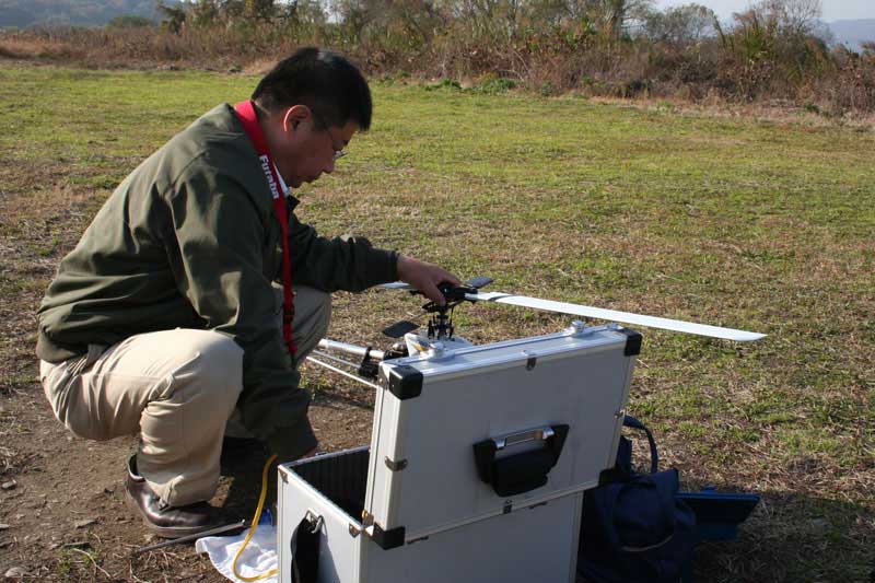 が。Eさんの車です。さっさと準備をし堤防をあがっていくとEさんがちょうど1フライトし終えた直後でした。今日は仕事がお休みだそうで、スカディーを飛ばしに来られたとのこと。早速拝見です(^^;;