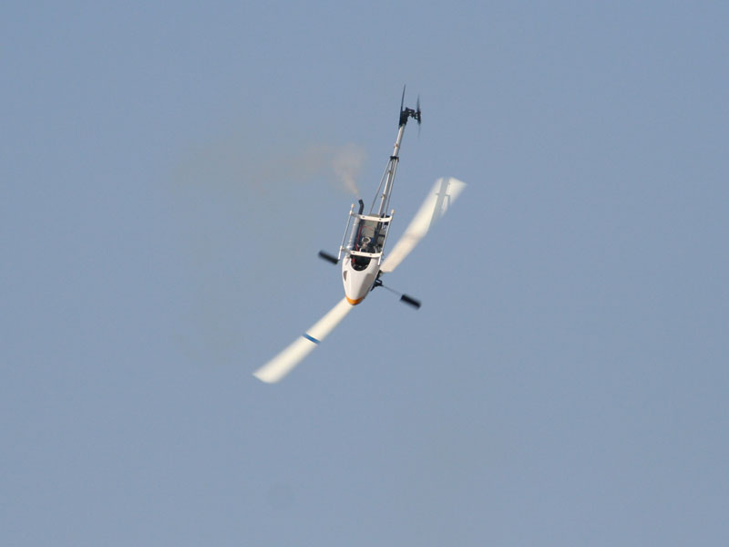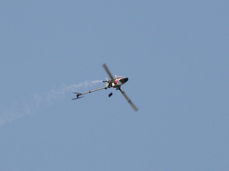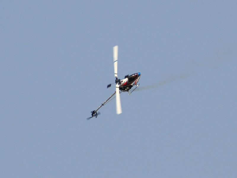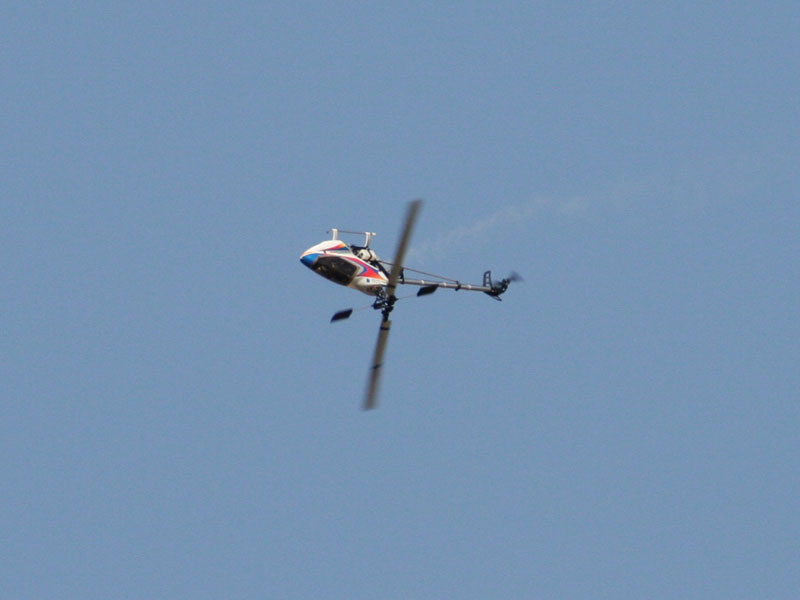 。 ありがたくお受けすることとし、Eさんが飛ばし始めます。バック飛行や対面での平行移動なども見せていただき、いろいろと教えていただきました。その後軽 く上空〜3Dをされ、無事帰還。前回の飛行時に見られた高速旋回中のエンジンの回転落ちはずいぶん改善したようです。テール増速用のプーリーを純正に戻し たらしいのですが、これが効いているのかもとのことでした。