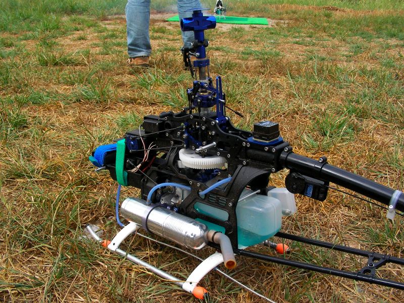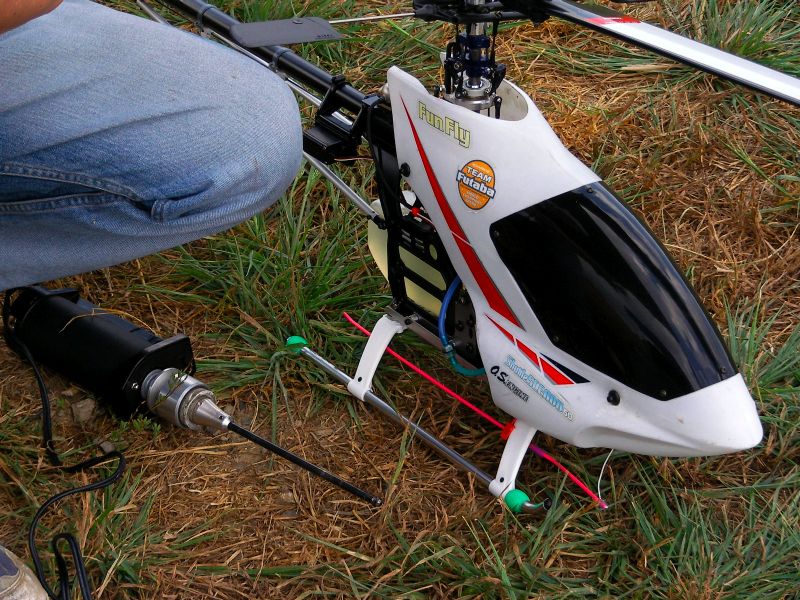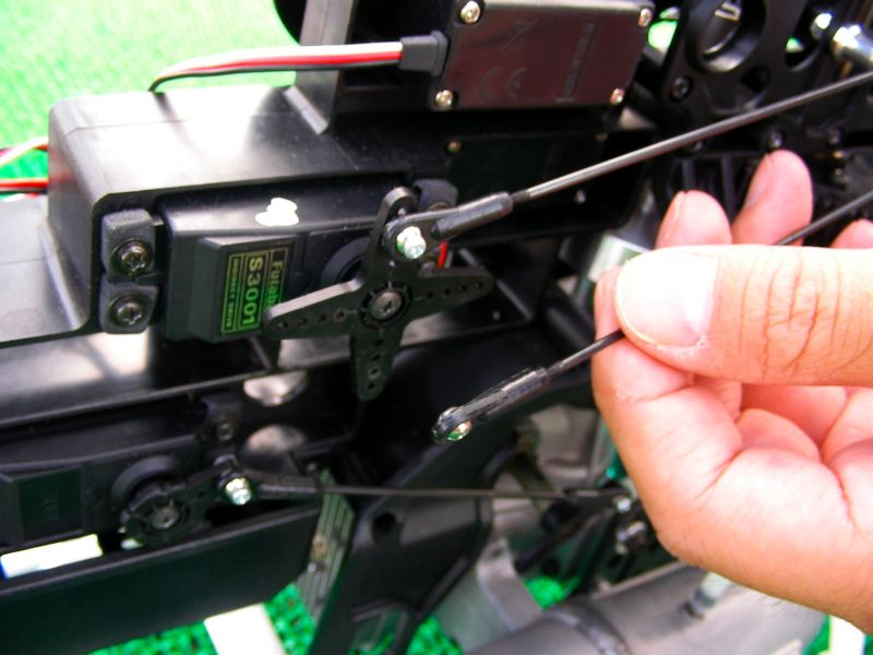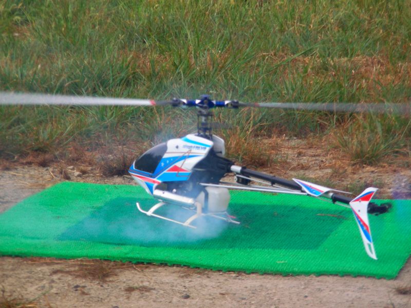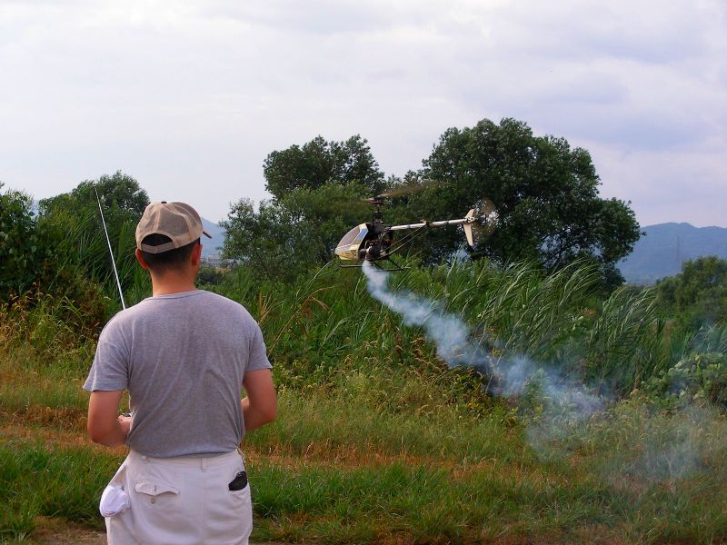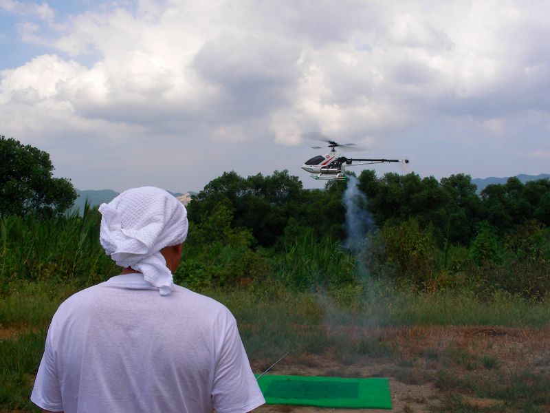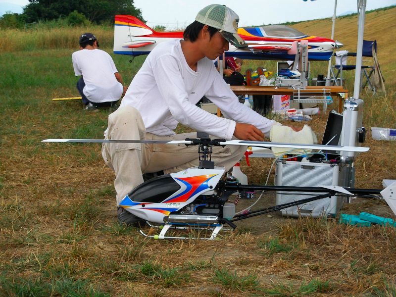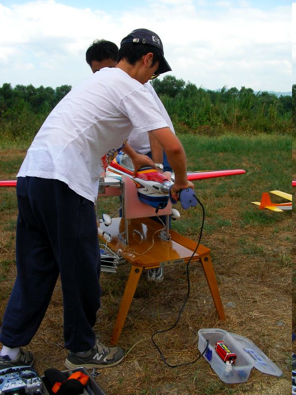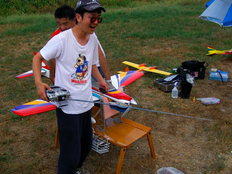 さて、僕はといいますと先日修理調整したばかりのOSスカディーを。1タンク目は特に問題なく飛ばしていたのですが、2タンク目でフリップに挑戦したとこ ろ、ラダーを切ってしまい指ノーコンで墜落。I元さんに無事探し出していただきました。アイドルアップ状態でしたが、6月の時ほど激しくはない損害。しかしどう見てもこのOSスカディー、整備時間のほうが多い気がするのは何故?(←※注 単に下手だからです) YSスカディーはヒート気味ながらも何とか飛ばせました。ただ、アイドルアップ時、上昇 を掛けると機体が左へ流れてしまうのでトリムで無理矢理調整するもなかなか収まりません。その後I店主の指摘によってラジアスブロックがゆるんでしまって いることが判明。2つあるイモネジのうち1つがかなりゆるんでしまっていたため位相が変化しまくりの状態でした。墜落しなくて良かった〜。あと、舵が敏感 すぎるとの指摘もあり、スタビライザーは鉛と真鍮のウェイト2本立てに戻しました。あと、EXPの設定もしていただきました。よくわからなかった機能です がどうやらスティック中心付近の感度が緩くなるようです(解釈間違っているようならお知らせ下さい)。設定後あまり飛ばせていないので、今後実感してみたいと思います。