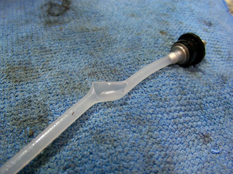そんな感じで半日が過ぎ帰宅。家に帰ってOSスカディーをバラし始めました。修理前に燃料タンクから燃料を抜こうとしたのですが、なかなか抜けません。注入はできるのですが、排出ができない状態です。タンクを降ろし点検してみると タンク内のシリコンチューブが裂けてしまっていました。墜落直後の写真(上)ではサブタンクに燃料がありません。もしかすると墜落の原因の一端であったかもしれませんが、墜ちてしまったものはどうしようもありません。とりあえずYSスカディーのチューブも同時に交換しておくこ とにしました。