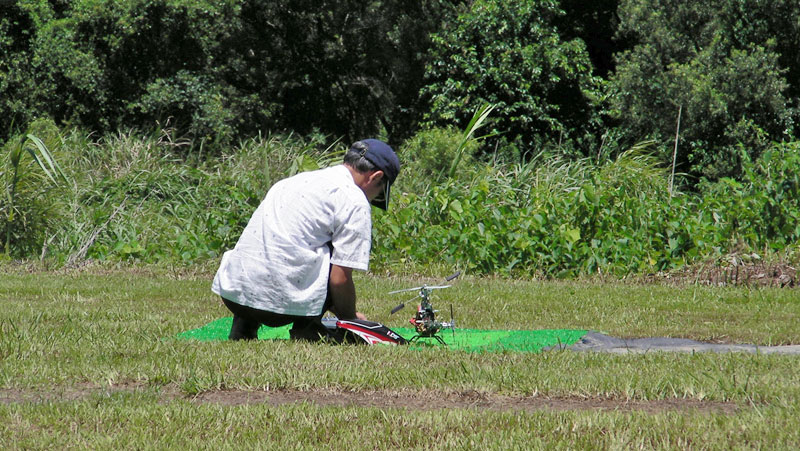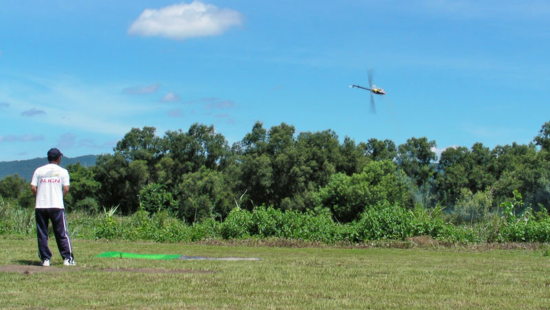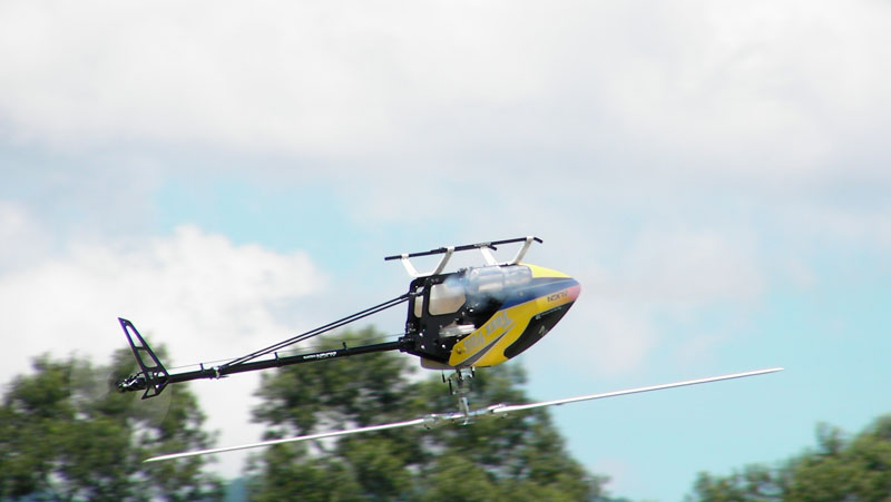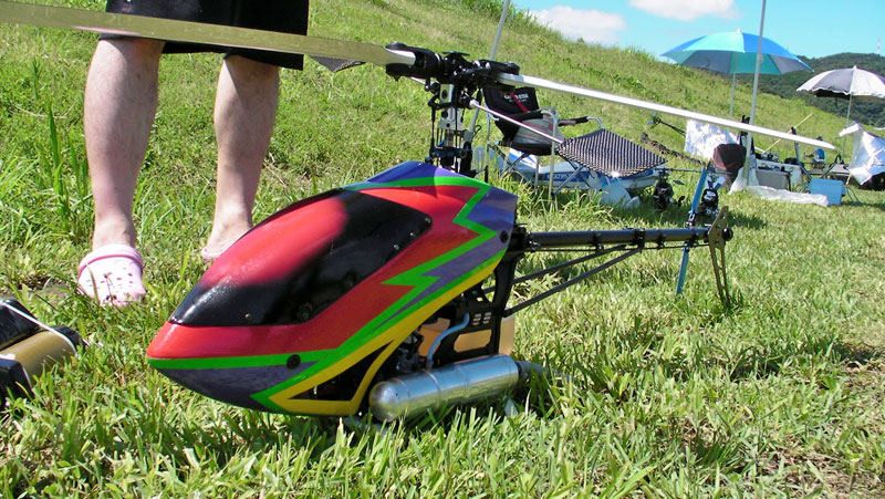 。前後のハーフループなんかを練習してみました。ラダーニュートラルがずれていたり、トラッキングがあっていなかったりといろいろありましたが特に大きなトラブルもなく終了。初号機のラストフライトでハードランディング、スキッドが折れたくらいです。原因はノーマルモードのガバナー回転が低すぎ、ピッチ追従できなかったことと思われます(^^;;