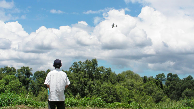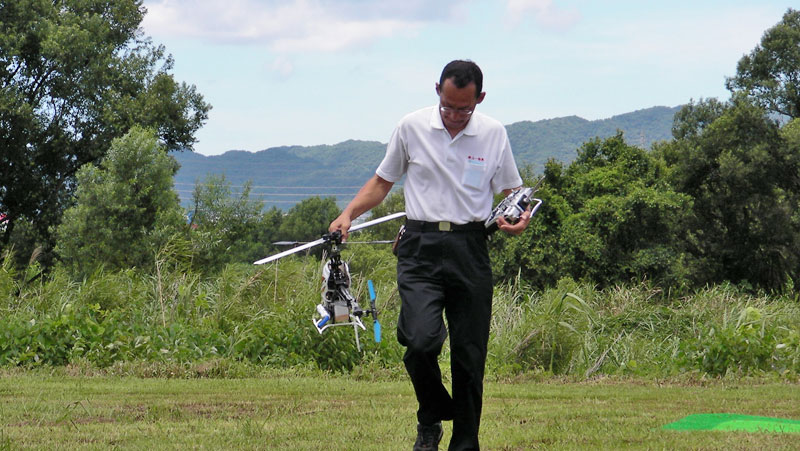 K2さんは電動オンリー。複葉機とKDS450、T-REX450です。450は機体が小さいためちょっと見難いのですが、パワーの割に軽いので複雑な演技も色々できます。実機での舵練習用にはもってこいのようです