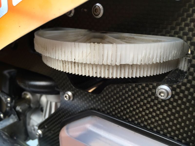 700Nはエンジン絶好調。15%ニトロなので大したパワーは出ないはずなんですが、気温とニードルがマッチしてるんでしょう、ホバリング時からいい感じに。で、いつもの様にカッ!とスロットルを煽って上空へ。ターンしながら帰ってくる途中でギャ〜(ノ゚ο゚)ノ…とギヤが飛び、オートロで無事回収。オートロ覚えておいて良かったです(笑) 予備ギヤがあったはずなので交換と相成ります(^^;;