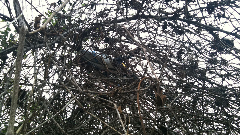 回収に向かいますが、滅多に落ちない地点なので結構捜索に時間がかかりました。ビーコンを探すこと数分、頭上から聞こえてきました。見上げると弐号機が高さ4〜5mの木に引っかかっています