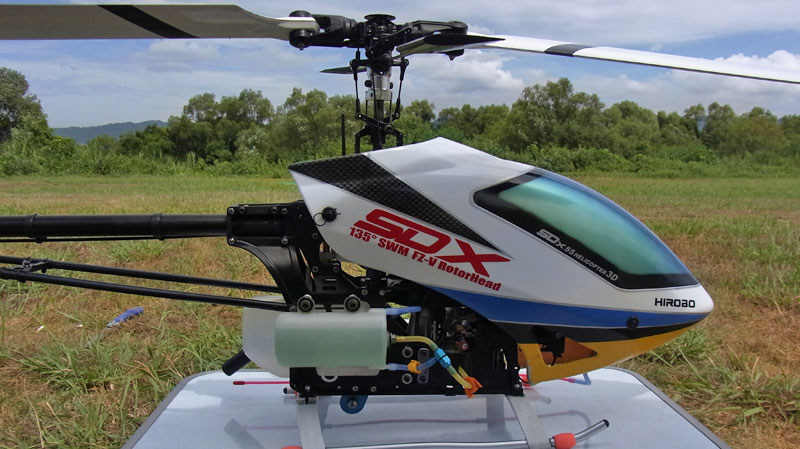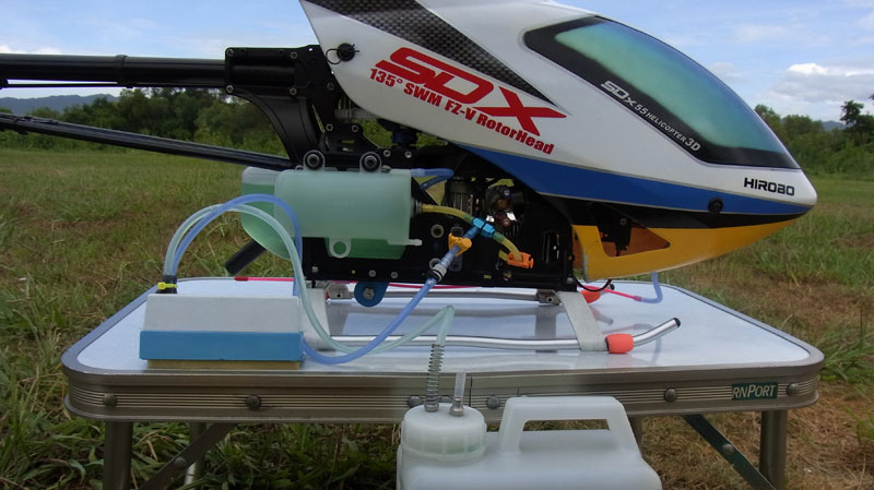 さて、まずはエンジンの様子見。いい感じで回っています。ところが1/3タンクほど焚いたところで着陸させた際、テールローターに小石がヒット。その小石がメインローターにあたってしまい虎屋のローターがお釈迦に…