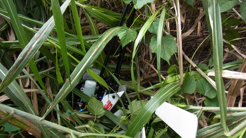 に阻まれ断念、遠回りですが奥からのアプローチに切り替えました。あちこち怪我をしながらビーコンを頼りに探すこと30分ほど。ようやく機体を発見。回収しました