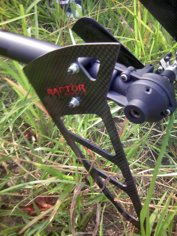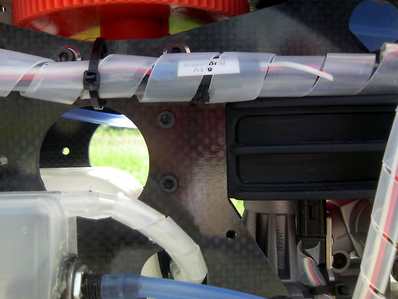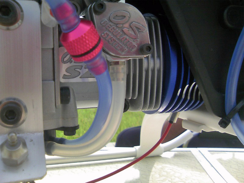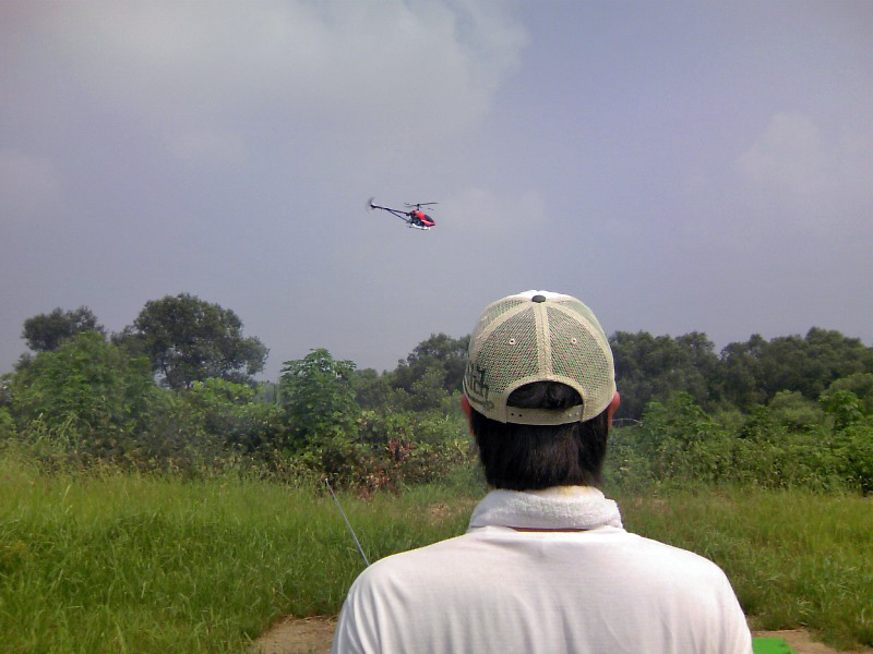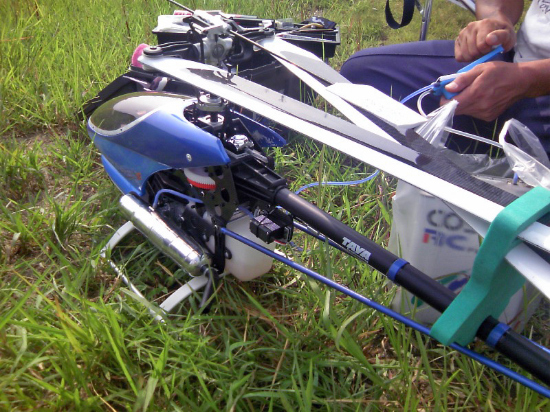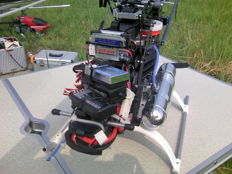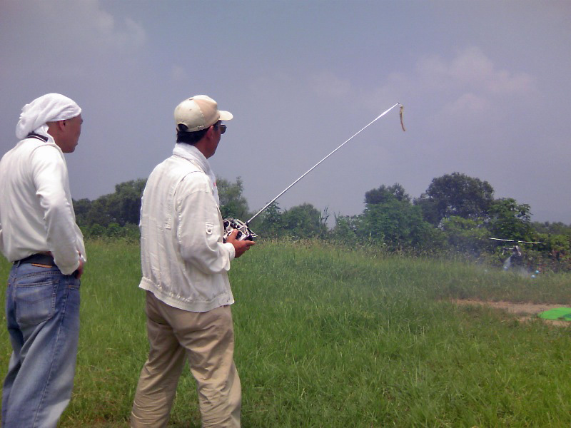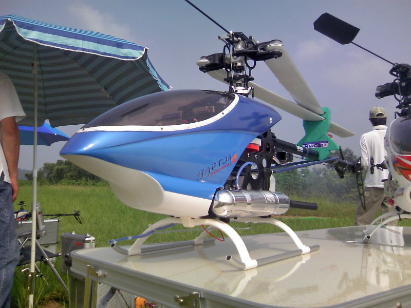 そして今日の目玉はI戸さんのBravoです。なんと、Raptor仕様の真っ青な機体で登場です。受信機バッテリはLiPo、5.8V仕様とのこと。メ カ満載で、普通は付いていないはずのバランサーなどが搭載されています。フレームはカーボン仕様、エンジンはOS90のポンプ版です。今までのBravo と違い、色々と工夫されているようです。今日が初浮上ということで燃料が全く入っていないタンクに燃料注入、そしてならしていきます。ホバリングだけかと 思ったらすでに上空旋回まで。何でも早いI戸さんでした(^^;;
