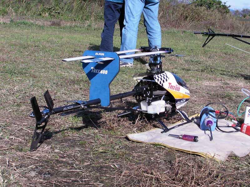 これではエンジンはかかりません。あきらめかけたその時に、心優しいKさんが【予備のT-REXを飛ばすからワシのスカディーのヤツ使いなよ】と声をかけてくださいました。ありがたくカップリングをお借りし、再起動です。幸いなことにエンジンはほぼ一発で始動。最初にプレッシャーをかけなければいけないのが少々面倒ですが、その後は力強く