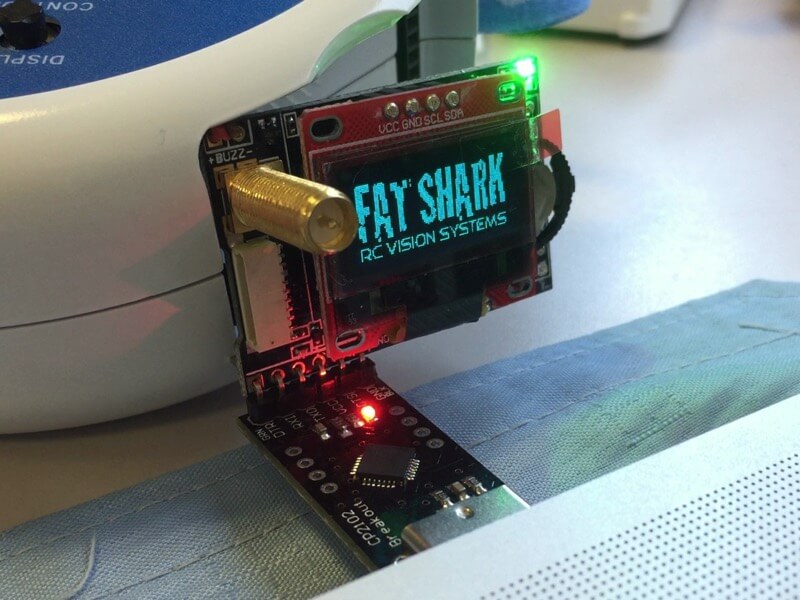 あとはゴーグルのレシーバーを書き換え。RealAccのRX5808を選んでますが、ソフトウェア部はオープンソースで提供されてます。G9CNファームで書き換えるとFAT SHARKロゴが出現。