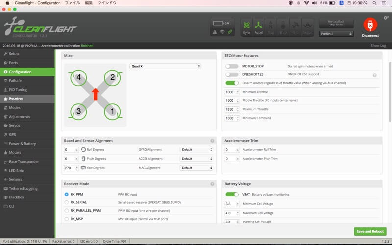 設定はCleanFlight(以下CF)を使って行います。ついでにFWもアップデートしておきました。CleanFlightはChromeアプリなのでOSを選ばずラクチンです。NAZEはUSBコネクタの位置の関係上、90°ずらして設定しているのでCFでもそのように設定しておきます。機体を動かすとディスプレイ上の機体もグリグリ動くのでジャイロの方向があっているかどうかがわかります。送信機との接続が確認できたらまずはレンジの調整。Futabaは1520μsの信号なのでサブトリムやエンドポイントを使って1000-1500-2000で各チャンネルを調整しておきます。ESCのキャリブレーションもCFでできます(^^♪設定項目が格段に増えています。正直良くわかりません(笑)
