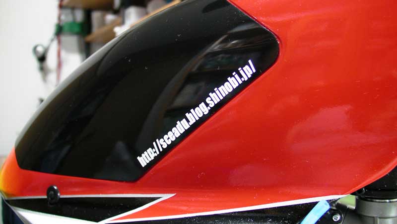 今のところマスキングの予定はないので、お手軽にロゴから。キャノピーが黒一色なので、ここにこのブログのアドレスとパイロットネームを記載することに し、デザイン後切り出し開始。かなり大きな音がしますので夜間は使いにくいかなぁと思います。刃の動きを見てみるとものすごく細かいです。曲線部なども正 確にトレースし刃の向きを微妙に変えながら切っていきます。おお〜家庭用CNCみたいな感じ。かっこいい〜 なお、精細←→高速モードで約10段階の切り分けが可能ですが、あまり違いはわかりませんでした(笑)