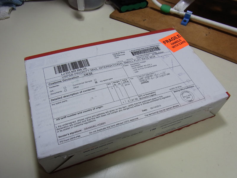 。先日、カルフォルニアのGrandRCに注文していたパーツがやっとこさ到着したこともあり、早速パーツでも組むことにしました。USPSのGlobal Priorityで送ってもらったのでトラッキングができない発送方法でしたが、発送から1週間ほどで到着しました。本当はテンプゲージが欲しかったんですが、品切れでrefundするハメに。手数料