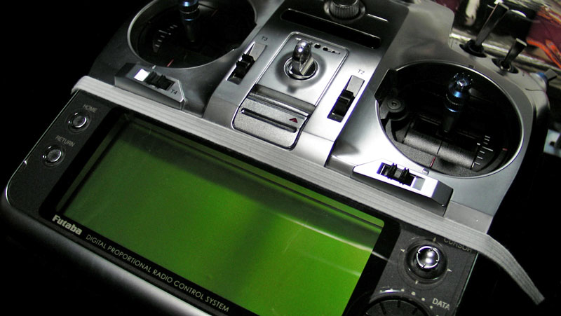 。コーナンをぶらついていたらABSのφ1mmロッドがあったのでこいつを支柱としました。適度な柔軟性と強度がある感じです。塩ビ板をグローブ内部に収まるように切り、固定フックを4隅に貼りつけ。ABSロッドの端々を曲げて抜け防止としフックに引っ掛け完成。 ただ、これだけだとプロポと塩ビ板の間が固定できないのでゴムひもでプロポの液晶上部をまとめて縛るような感じにしました。また、塩ビ板に対するプロポの前後移動を防ぐため、プロポハンドル部分を引っ掛けるような形に塩ビ板前方を折り曲げました。