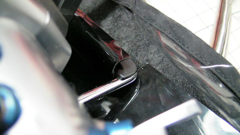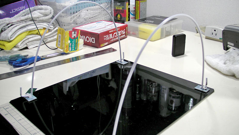 ロッドは左右方向にはフリーで動くので折りたたみも可能です。カバー上面にはコードフックを貼りつけあるので、使用時にはここにロッドを引っ掛けてクリアランスを保つようにしました。