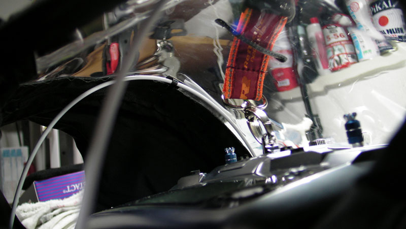 塩ビ板をグローブ内部に収まるように切り、固定フックを4隅に貼りつけ。ABSロッドの端々を曲げて抜け防止としフックに引っ掛け完成。 ただ、これだけだとプロポと塩ビ板の間が固定できないのでゴムひもでプロポの液晶上部をまとめて縛るような感じにしました。また、塩ビ板に対するプロポの前後移動を防ぐため、プロポハンドル部分を引っ掛けるような形に塩ビ板前方を折り曲げました。