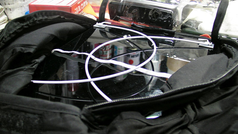 で、カバー内部の空間確保です。TURNIGYのカバーはフニャフニャなのでたたんでしまえばかさばりもせず仕舞い勝手は良好なのですが、それが却って仇となり使用時にはプロポとの一定のクリアランスが確保しにくいのです。そこでカバー内部に支柱を埋め込むことに。ただ、せっかくなので折りたためるようにしてみました。用意するのは塩ビ板とABSロッド、ロッド固定フックくらいです。当初は支柱をカーボンロッドにしようかと思ったのですが入手困難なのと加工性の悪さから却下