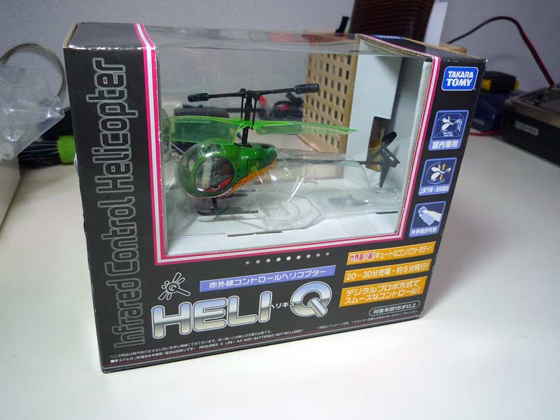 空モノIRラジコンがいろいろ出ていますが、今回購入したのはタカラトミーの【ヘリQ】。別にタカラトミーの回し者ではないのですが、広告や宣伝が旨いのでついつい乗せられてしまいます。IRヘリの先駆け、ハニービーが出た時もかなりの衝撃でしたが、このヘリQのすばらしい点は片手操作が可能ということ。(持ってませんが)任天堂のWiiに附属するようなリモコンです。