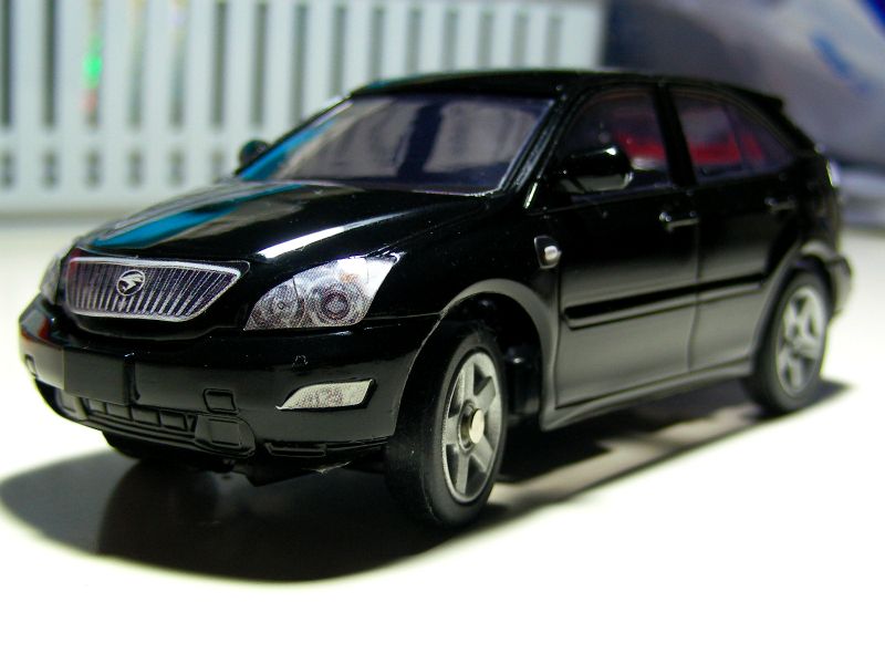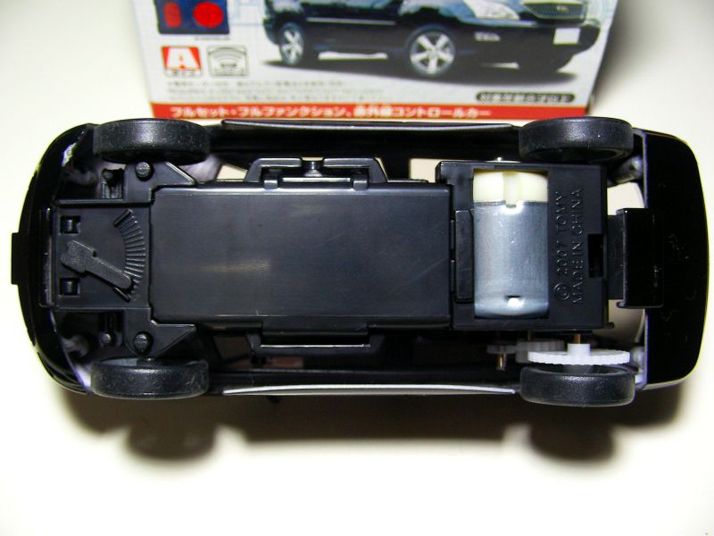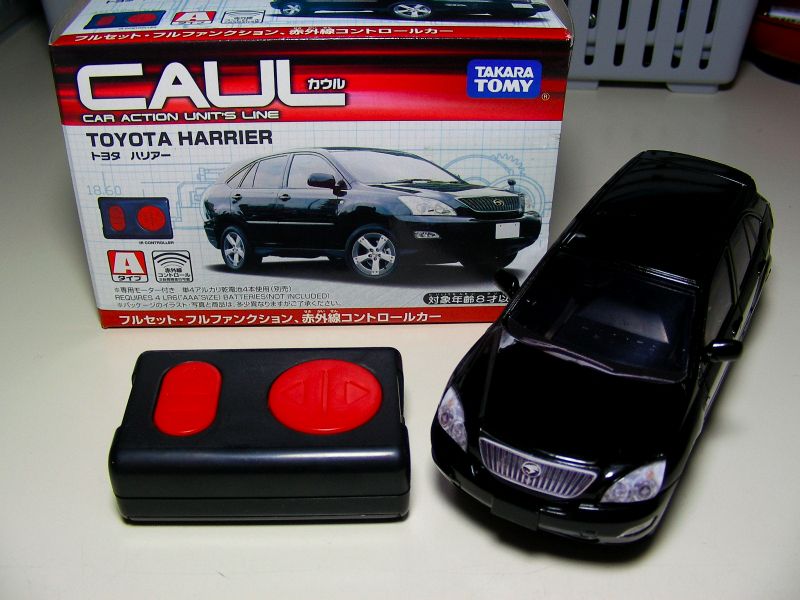 スカディーに関係するものではないのですが、この間近所のヤマダ電機に立ち寄った際、おもちゃ売り場でハリアーのIRラジコンを発見。普段は車モノにはあまり興味がないのですが、540円(定価は600円)という安さと実際に乗っている車種であったことから購入。発売元はタカラトミー、ブランド名はCAULというのだそうです。早速家に帰って組み立てます。組み立て、といってもほぼ完成品。送信機を含めたメカ類は完全にアッセンブルされており、特に手を入れる必要はありません。主な作業はタイヤの装着、ドアミラーの装着、デカール貼り付け、くらいなものです。ちなみにスケールは1/38。送受信機含めても手のひらに載ってしまうほどのものです。